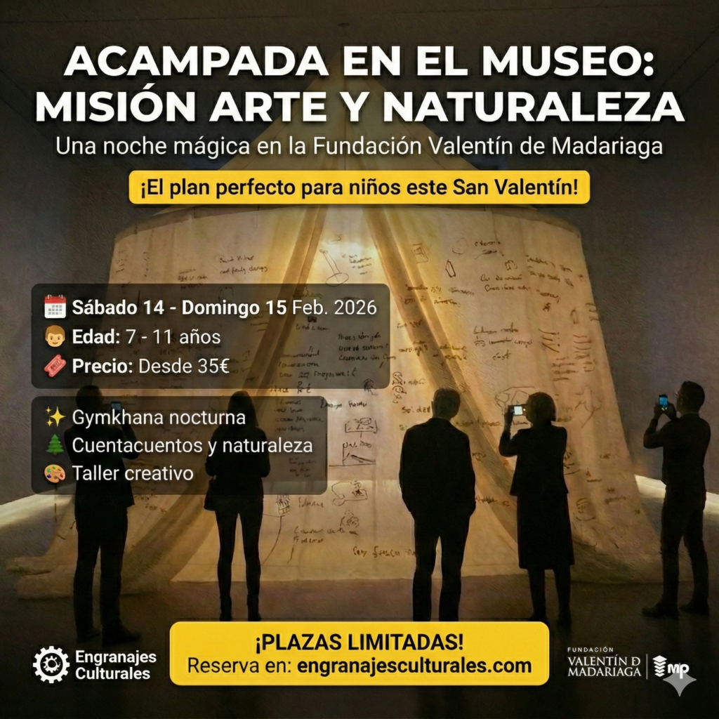 ¿Buscas el plan perfecto para este San Valentín? Este año, cambiamos las reglas. Mientras vosotros disfrutáis de una cena romántica o de la ópera (Con super descuento si dejas a tus peques en nuestra acampada) , vuestros hijos vivirán una noche mágica acampando en el interior de un museo de arte contemporáneo.